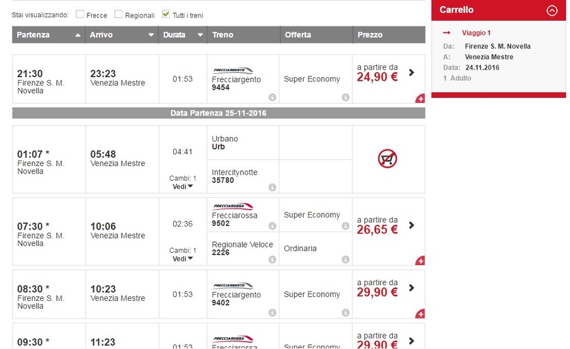 Билеты на поезда можно купить в любой день, но выгодно покупать заранее. За месяц до поездки билеты самые дешевые. Приобрести их можно в кассе или автомате на вокзале и на сайте Trenitalia. Подробная информация обо всех способах оплаты есть здесь.