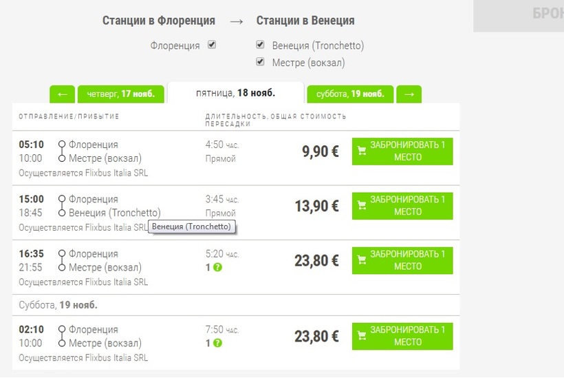 Прямые автобусы компании Flixbus ездят 2 раза в день, обратите внимание, что автобус в 15:00 останавливается в Tronchetto, это конечная станция на острове, но все автобусы предварительно делают остановку в Местре. Поездка занимает 4-5 часов.