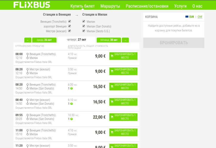 Предложения компания Flixbus намного интереснее, автобусов очень много, они начинают ездить с 8:00, а последний отправляется в 00:30. Как видите билеты стоят от 9 евро за 4 часа поездки из Венеции в Милан. При покупке обратите внимание на станцию отправления и на станцию прибытия. Из Венеции автобусы отправляются с острова и с автостанции в Местре, прибывают в Милан на автостанции Lampugnano и с Sesto S.G.