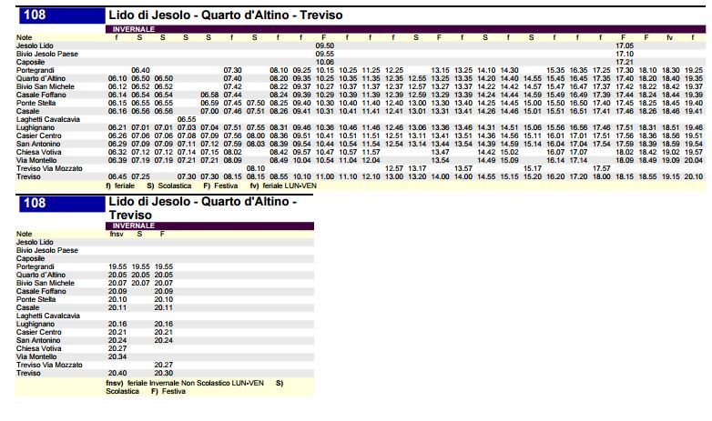 Второй вариант: На автобусе все той же компании ATVO под №10А можно доехать до Портегранди. Затем, не уходя с этой остановки можно сесть на автобус №108 автобусной компании Mobilità di Marca и доехать до Тревизо. Бывает, что автобус этой компании отходит из самого Лидо Ди Езоло, так что можно уехать и напрямую. Поэтому важно изучить расписание автобуса №108.
