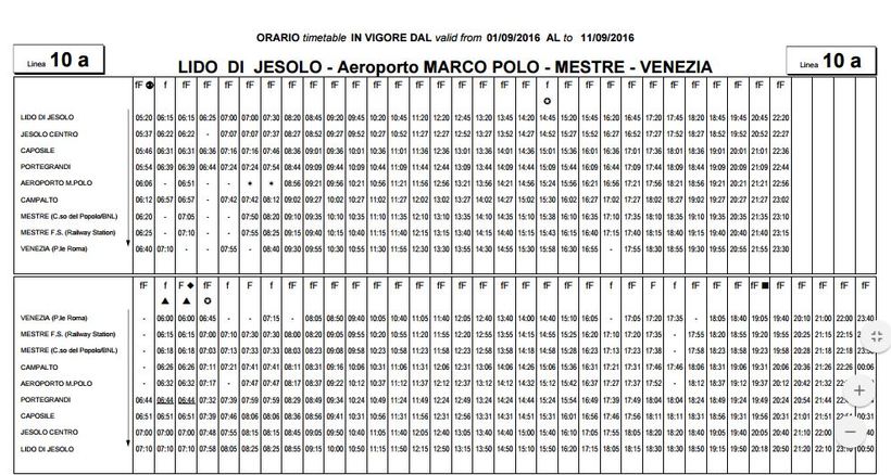 Как видно, ходят автобусы с раннего утра и до позднего вечера. Делают в пути ряд остановок. Прибывают автобусы в Местре на железнодорожный вокзал Venezia Mestre по адресу Viale Stazione, 30171 Venezia. Кроме того, в Местре автобус делает и еще одну остановку, по адресу Corso del Popolo, 30, 30172 Mestre.