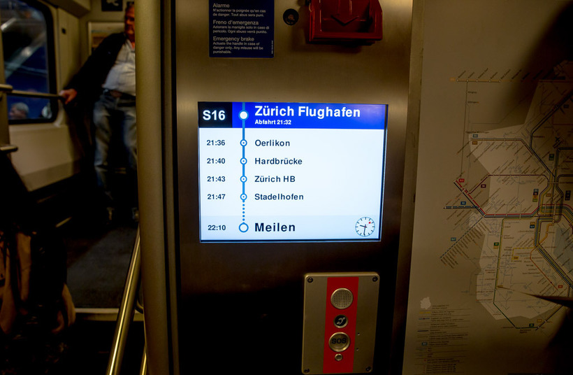 Нужно спуститься на эскалаторе под аэропорт, где и расположен вокзал. Поезда ходят часто, примерный интервал 15 минут. До Цюриха идут либо скоростные ICN, IR, они идут без остановок, либо электрички с буквой S перед номером, у них есть остановки. Для первых дорога займет 6 мину, для вторых около 10. Вагоны разделены на 1 и 2 классы, но сильно не отличаются по комфортабельности. В самом вагоне есть табло, на котором отслеживаются остановки.