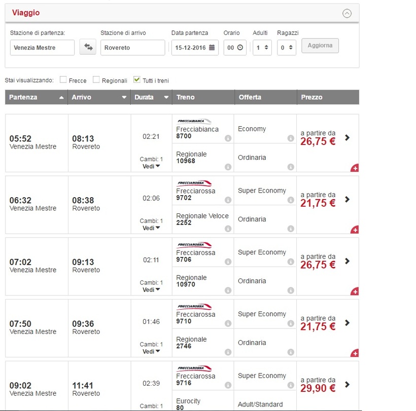 Чтобы посмотреть расписание, купить билеты на сайте Trenitalia нужно вводить от станции «Venezia Mestre» до «Rovereto». Система предложит все возможные варианты с пересадкой на станции «Verona Porta Nuova». Поезда ездят весь день с 6 утра и 9 вечера.