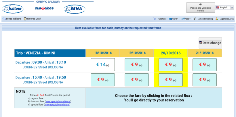 Автобусами Eurolines можно доехать с пересадкой в Болонье, но зато за 9 евро. Автобусы отправляются от автостанции Tronchetto в 9:00 и 15:40, затем делают остановку в Местре. Хоть и придется сделать пересадку, но в общем поездка займет 4 часа, но что мне не нравится в этом варианте, так то, что автобусы прибывают в Riccione, город, находящийся рядом с Римини. До станции Rimini придется добираться на поезде.