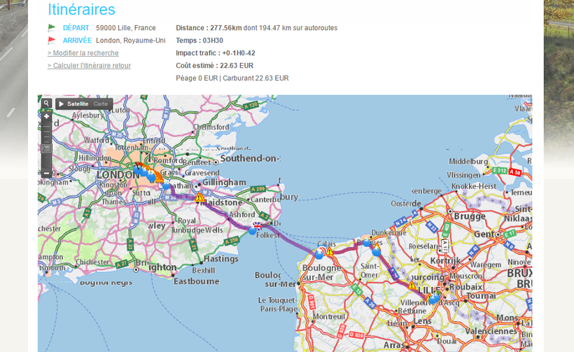 По территории Франции едем по А25 / 16 до Кале. Затем переправа через Ла-Манш (паром или Евротоннель на специальных платформах). По территории Великобритании стоит ехать по М20 / А2.