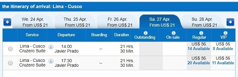 Два автобуса из Лимы в Куско курсируют в ежедневном режиме. Первый отправляется в 14:00, а второй — в 17:30.