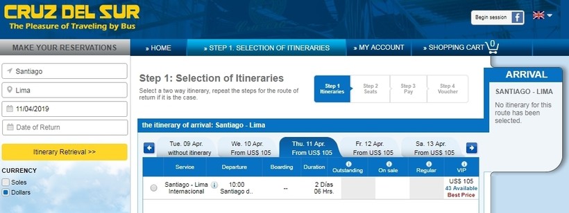 По такому маршруту ездит мало перевозчиков. В день доступен один или два рейса, а бывает — и вовсе нет. Мне удалось найти от перуанской компании Cruz del Sur.