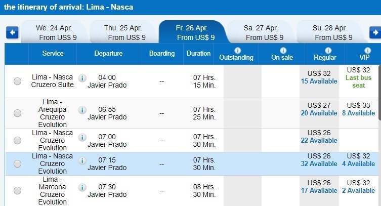 Ниже приведена информация о том, сколько часов вам потребуется, чтобы добраться от Лимы до Наски, а также приведена примерная стоимость проезда (средняя цена билета) на том или ином виде транспорта.