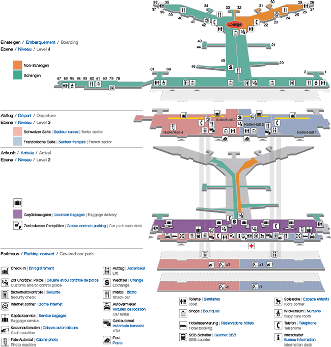 Когда я рыскала по форумам в надежде найти что-то полезное про аэропорт Базеля, то немного запуталась с его названиями. Как этот аэропорт только не обзывают! Некоторые зовут его «Euroairport», другие называют «Международный аэропорт Базель-Мюлуз-Фрайбург», а самые умные зовут аэропорт «Аэропорт Базеля-Мюлуза». Я отношу себя к последней категории граждан, поэтому именовать аэропорт буду именно так:) Знаете, в чем самая фишка аэропорта?:) Он управляется сразу двумя странами - Францией и Швейцарией, хотя сюда еще прилетают многие немецкие рейсы. Территориально аэропорт принадлежит Франции, он находится в городке Мюлузе. Аэропорт «Аэропорт Базеля-Мюлуза» находится в нескольких километрах от швейцарской границы и километрах 10 от Базеля. Аэропорт не то чтобы большой, он просто огромный. Блин, ребят, да это целый отдельный город в городе! Даже я, заучив наизусть всю информацию об аэропорте, минут на 5 растерялась. Если бы ехала, ничего не изучив об аэропорте, то вообще бы развернулась и улетела обратно домой от безысходности:). В аэропорту всего один терминал прилета и вылета, но он огромнейший и поделен на два сектора: на французский и на швейцарский. Чтобы перемещаться между ними можно без билета, необходимо только показывать паспорт:) А вот с парковками все печальнее - нельзя перейти с французской на швейцарскую и наоборот. Хотя французская намного дешевле. Во швейцарской же зоне целых 7 парковок: