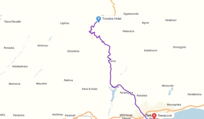 Расстояние между Лимассолом и Троодосом составляет 20 километров или 12 миль по прямой и 49 километров или 30 миль по автодорогам.