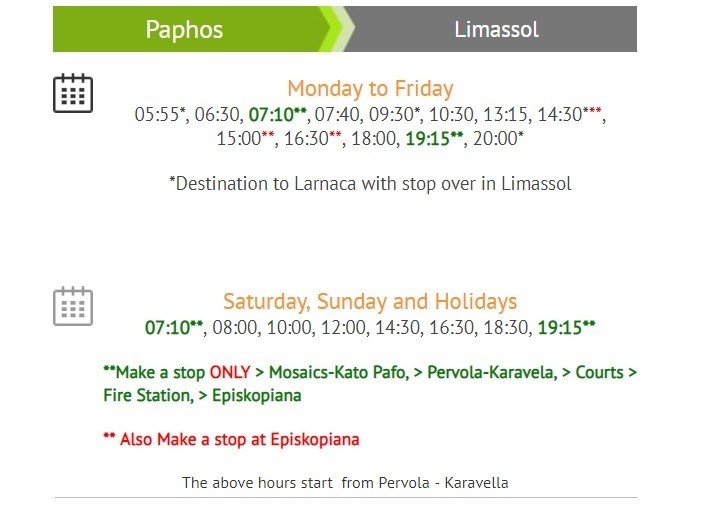 Самый бюджетный способ добраться до Лимасола из Пафоса — это поездка на автобусе. Кстати, на них ездят в основном туристы. Отправляются автобусы с Karavella Bus Station. Перевозчик — Intercity Buses. С понедельника по пятницу до Лимасола отправляется 13 рейсов. В субботу, воскресенье и праздничные дни по этому маршруту ходит только восемь автобусов. Актуальное время отправления можете посмотреть на скриншоте.