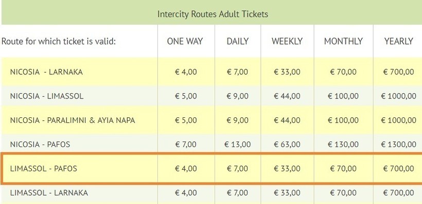 Все цены, актуальные на текущий момент, указаны на скриншоте. Стоимость билета из Лимасола в Пафос и обратно не отличается.