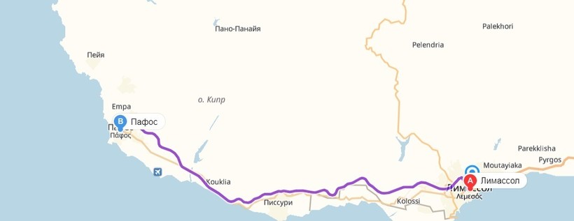 Ниже приведена информация о том, сколько часов вам потребуется, чтобы добраться от Пафоса до Лимассола, а также приведена примерная стоимость проезда (средняя цена билета) на том или ином виде транспорта.