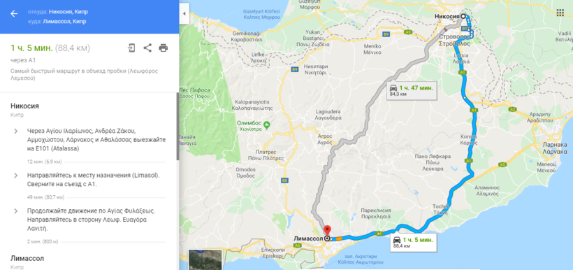 До Лимасола можно доехать за час с хвостиком, ведь расстояние между городами — 85 км. Быстрее всего двигаться по трассе А1.