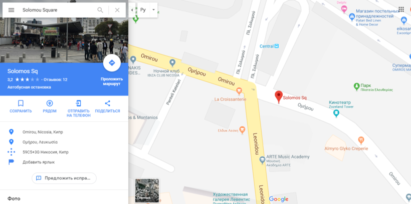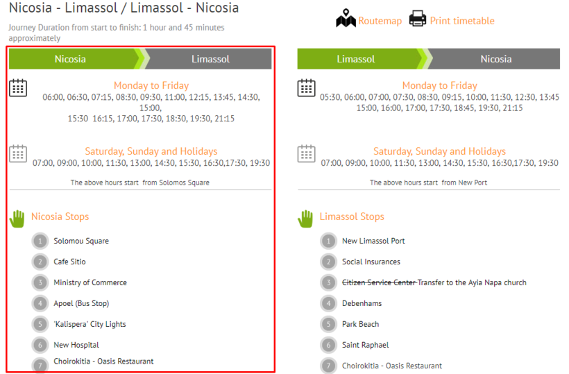 Но по городу есть еще 6 мест, где останавливаются автобусы. Эти остановки указаны на скриншоте. Также и в Лимасоле — конечная остановка у порта, но если вам нужно выйти раньше, такая возможность существует. На скриншоте указаны остановки по городу. В пути автобусы проводят 1 час 45 минут. В каждом автобусе есть кондиционер.