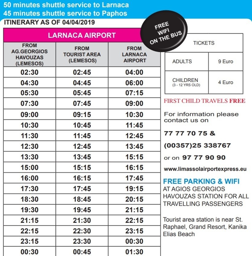 Крупнейший кипрский аэровокзал, который называется «Ларнака» находится почти в семидесяти километрах от Лимассола. Добраться до этой воздушной гавани вы можете на автобусах компании Limassol Airport Express. Всего 18 рейсов в день. Автобусы курсируют с 02:30 до 00:30.