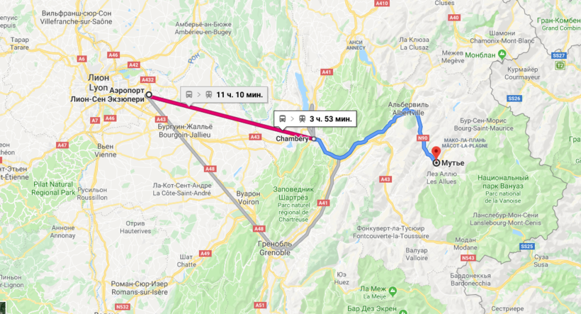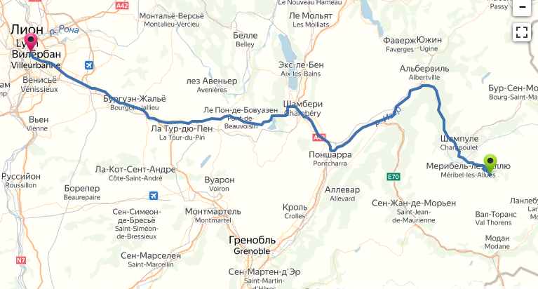 Я арендовала автомобиль на 3 дня. Мой путь лежал сначала по трассе А43, а потом по А430. Далее по четырехполосному автобану N90. Нужно обращать внимание на указатели, так как после того, как съедите с автобана, дорога идет прямо от указателя на Les Trois Vallees. Расстояние от Лиона до Куршевеля около 200 км. Время в пути составляет не более 3 часов, но я доехала (с учетом одной остановки и скорости 80 км/ч) за 4,5 часа. Дороги обледеневшие, путь лежал в горы, поэтому торопиться не хотелось. Ехала потихоньку, наслаждаясь живописными окрестностями.