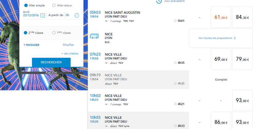 Отправление поездов проходит из таких вокзалов Ниццы: Saint-Augustin (Avenue Edouard Grinda) или Ville (12 Avenue Thiers). Прибытие в Лион на железнодорожную станцию Part-Dieu (5 Place Charles Béraudier).