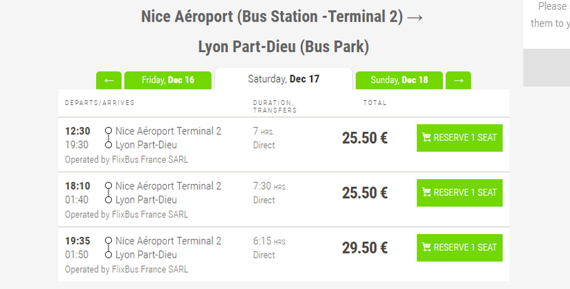 Добраться в Лион с курортного города Ницца можно и на пассажирских автобусах. Маршрут поездки обслуживают фирмы FlixBus и Ouibus.