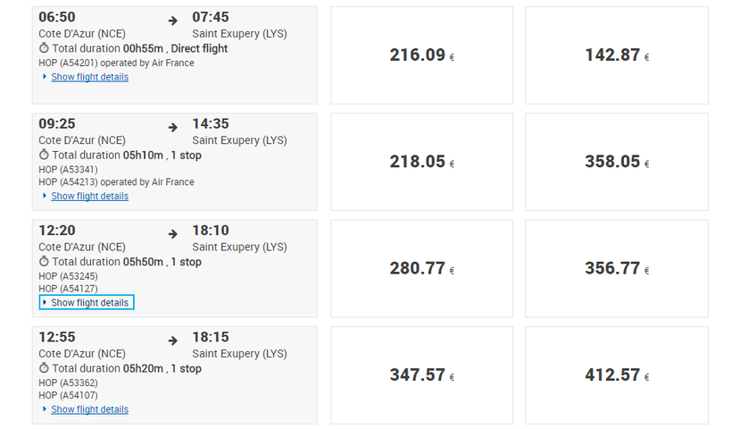 С аэропорта Ниццы Cote D'Azur (Rue Costes et Bellonte) улетает ряд самолетов как прямых, так и с пересадками в Бордо, Тулузе, Страсбурге, Париже. Прямых не более пяти.