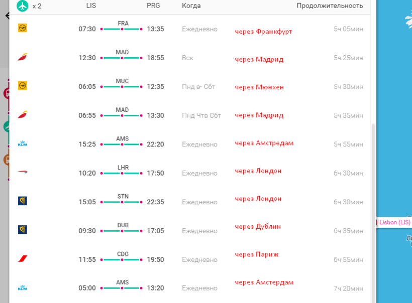 Это один из самых дешёвых и быстрых способов. На официальном сайте аэропорта Lisbon International Airport Guide можно просмотреть схемы терминалов и общую информацию. Есть два типа перелётов – прямой и с остановками. Каждый день есть прямой рейс на Прагу с продолжительностью в полёте 3 ч 20 мин.