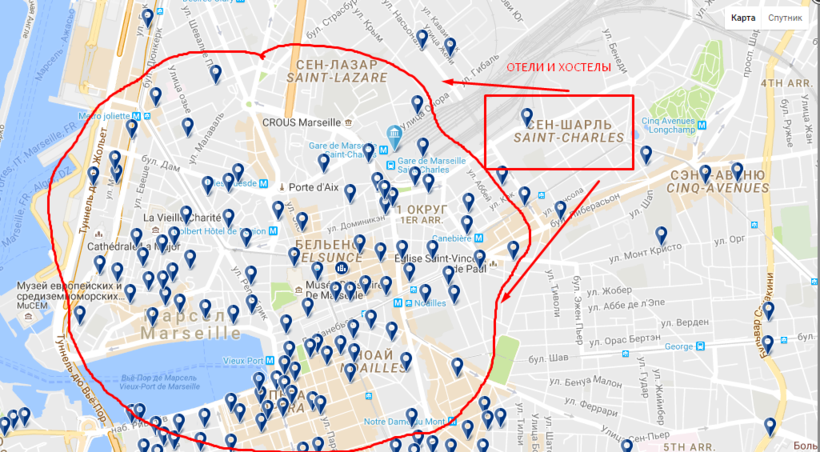 Здесь можно перекусить и выпить кофе, так как следующий поезд №9724, который довезет вас к Марселю отходит только в 13:25 и на месте окажется в 21:20 на вокзале Сен-Шарль. И опять вас ждёт большой промежуток времени, ведь следующий поезд, что доставит нас во Франкфурт отходит только в восемь утра. Пусть вас не пугает, что ночь нужно провести в незнакомом городе – возле вокзала находится несколько комфортабельных хостелов, где можно переночевать и позавтракать от 15 евро. Также, на более жирненькое портмоне, от 70 евро можно остановиться в отеле, их возле вокзала три, а если пройти чуточку дальше, то там у них, видать, гнездо).