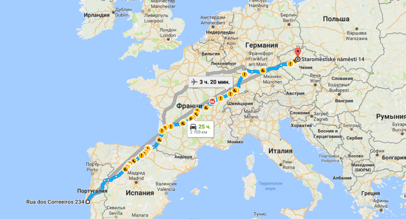 Лиссабон — Прага — маршрут на карте