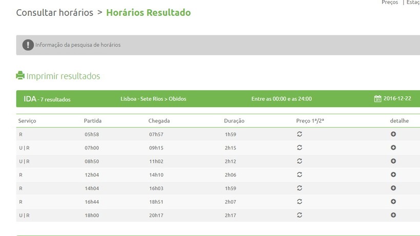 Со станции Sete Rios можно добраться в Обидуш на поезде. Это не самый лучший вариант поездки, но может подойти тем, кого, например, укачивает в автобусе. Почему не лучший? Начнем с расписания на сайте, всего семь поездов в день и минимум два часа в пути. Автобус останавливается лишь один раз – в городке Бомбаррал, поезд в отличие от него делает большое количество остановок.