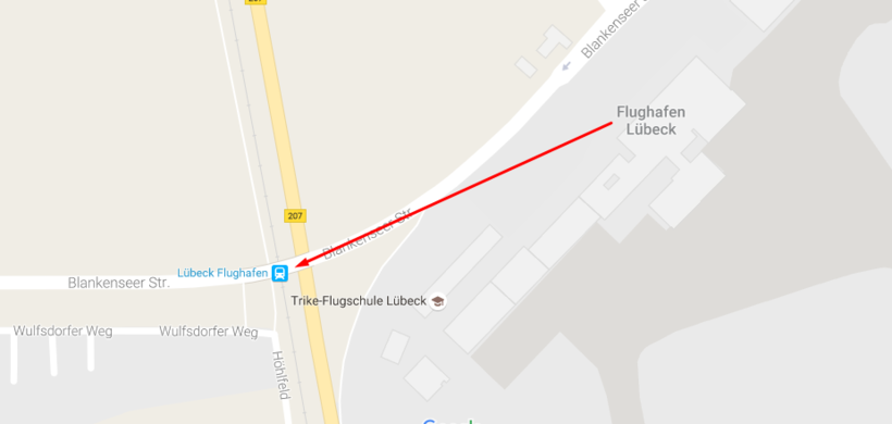Для тех, кто по какой-то причине не хочет ехать на автобусе, имеется вариант электрички. Должна сказать, что это чуть-чуть сложнее, но если вы не боитесь трудностей и никуда не спешите, то можете выбрать этот вариант. В 300 метрах от терминала находится станция Lubeck Flughafen, по адресу Blankenseer Str. 110, чтобы не потеряться прикрепляю карту: