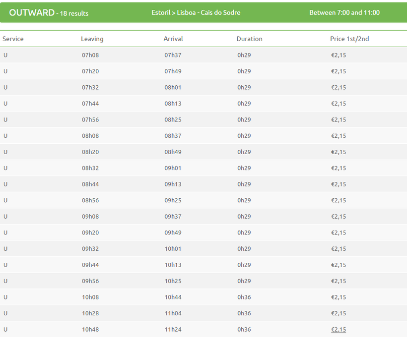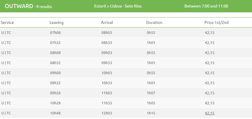 Электропоезда из Эшторила в Лиссабон ходит как минимум два раза в час. Время отправления, частота поездов и время поездки зависит от того, до какой станции в Лиссабоне вы будете ехать. Например, до вокзала Cais do Sodre (Кайш-ду-Содрэ) ехать 30 минут, до автовокзала Sete Rios поездка длится как минимум 55 минут.