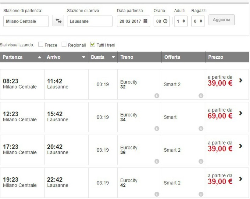 Расписание поездов из Лозанны в Милан на сайте Тrenitalia