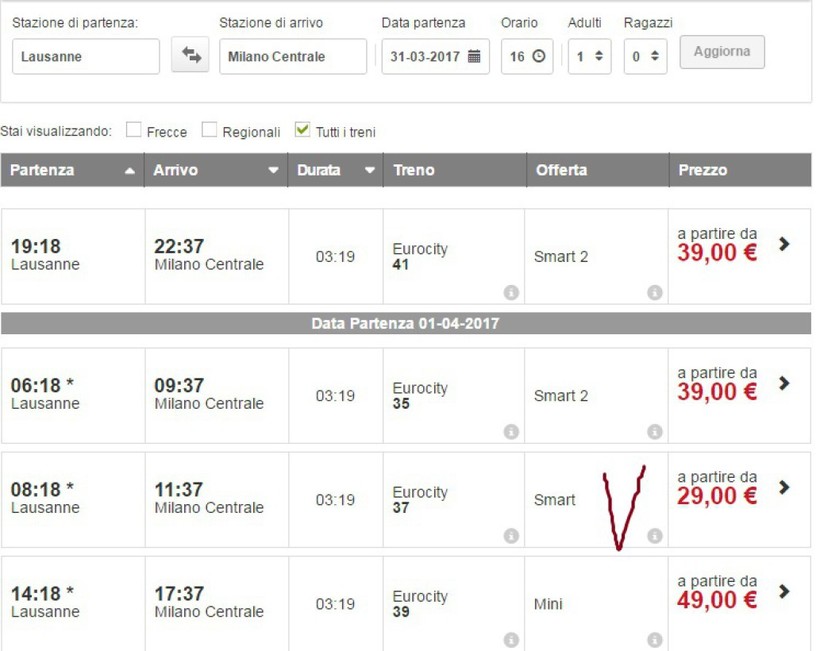 Билет на прямой поезд из Лозанны в Милан в вагон второго класса стоит 56 франков (52 евро). Если билет покупать заранее, то можно неплохо сэкономить. Например, на сайте Тrenitalia предварительная продажа билетов на некоторые рейсы из Лозанны в Милан осуществляется по 29 евро. Вот информация с этого сайта.