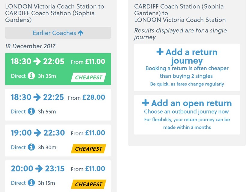 Добраться в Кардифф на автобусе можно за 3-3,5 часа. Рейсы National Express ездят с 8:00 и до 23:30: