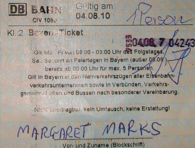 - Если же вы будете путешествовать с кем-то или едете всей семьей, тогда вам лучше всего приобрести «баварский» билет. Скажем, вас едет 3 или 4 человека, тогда вам необходимо приобрести билет «Bayern Ticket» на 2, 3 или 4 персоны. Такой билет действителен для группы людей, которая не превышает 5 человек. Если вы купите билет на 2 человека, стоимость будет – 28 евро, на 3 – 33 евро, на 4 – 38 евро и на 5 – 43 евро. После того, как вы приобретете «баварский» билет на нужное количество человек, вам нужно будет с ним ознакомиться внимательно, чтобы понять, как его заполнить от руки. На фото ниже, вы можете увидеть, как выглядит билет, это, по сути, самый обычный билет, только на большое количество человек. В специальной графе, вам надо написать имена всех пассажиров. К примеру, вы купили на 2 человека, значит надо написать два имени: Иванов Артем и Иванова Елена, это только для примера, чтобы вы поняли. Так же вверху есть графа, где надо поставить количество персон, то есть пассажиров. Так же есть важный момент, билет действует с 09:00 до 03:00 утра следующего дня, помните об этом. А если это выходные дни или праздники, тогда билет начинает действовать с 00:00 до 03:00 следующего дня.