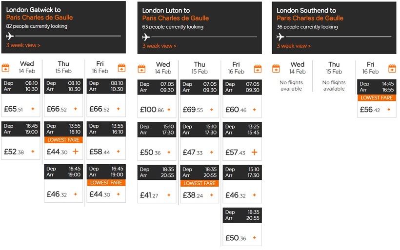 Самые дешевые билеты у авиакомпании Vueling, самолеты летают из аэропорта Гатвик в аэропорт Шарля-де-Голля. Немного дороже стоят билеты у Easyjet, их рейсы отправляются из аэропортов Гатвик, Лутон и Саусенд: