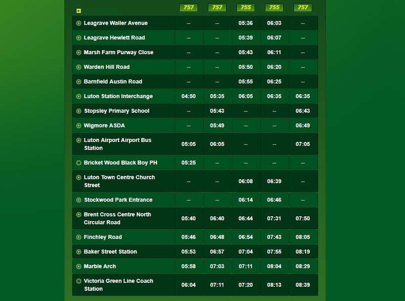 Дальше делают ряд остановок в городе: Marble Arch, Baker Street Station, Finchley Road, Brent Cross Centre North Circular Road. Большинство рейсов заезжают в аэропорт, и все останавливаются возле железнодорожной станции Лутона. Некоторые автобусы совершают еще ряд остановок, точное расписание есть здесь: