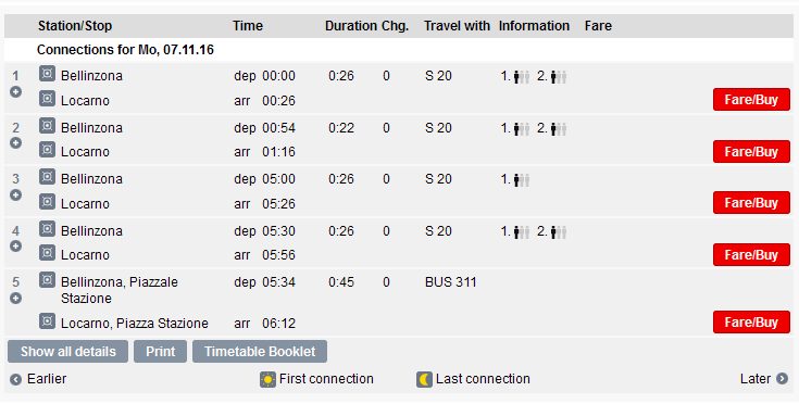 Первый поезд отправляется в сторону Локарно в полночь, следующий – в 00:54. Далее есть перерыв до 5 часов утра. В течение дня поезда и автобусы выезжают в сторону Локарно едва ли не каждые полчаса. Последний автобус отправляется в 21:34, последний поезд – в 23:00. В пути нужно будет провести минут 20-25.