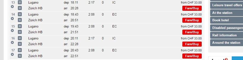 Отправляются поезда с вокзала в Лугано, который находится в центре города:Прибывают же поезда на вокзал Zürich HB, который также расположен в центральной части:Комфортабельность поездов по данному маршруту достаточна для поездки небольшой длительности. Кроме того, в ходе путешествия можно насладиться великолепными видами из окна, получив за цену билета еще и бесплатную эстетическую экскурсию.
