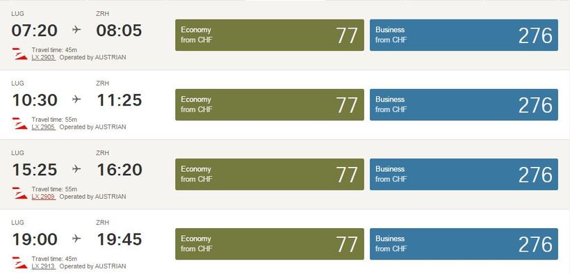 Учитывая наличие аэропортов в обоих городах, не упомянуть о таком варианте просто нельзя. По маршруту из Лугано в Цюрих самолеты летают, обслуживает их Austrian Airlines, но билеты продает почему-то Swiss Air на своем сайте. Вот скриншот: