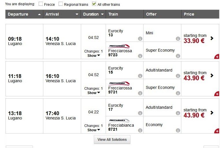 Добраться из Лугано в Венецию можно ежедневно. Все рейсы предполагают пересадку. Некоторые даже 2-3. Но чаще всего в расписании встречается вариант с пересадкой в Милане. Пересадка происходит на Центральном вокзале Милана и не требует поездки с одного вокзала на другой.