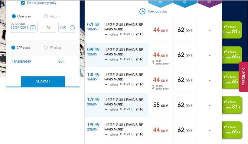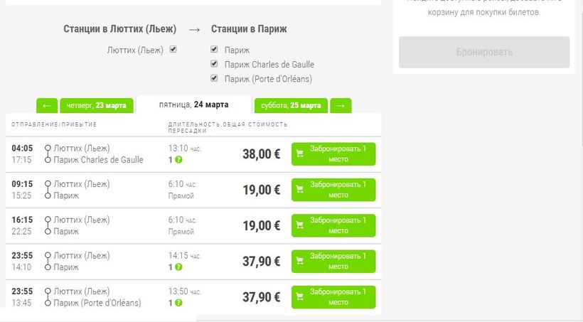 Скажу сразу, прямые рейсы есть и на железной дороге, притом их тут куда больше, по сравнению с автобусными. Рейсы обеспечиваются французской железной дорогой, поездами класса Thalys. Поэтому и искать расписание лучше на сайте французских железных дорог, там удобнее фильтровать именно прямые поезда. Вот скриншот с фрагментом расписания:
