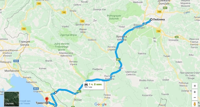 Расстояние между Любляной и Триестом составляет 44 километра или 27 миль по прямой и 93 километра или 58 миль по автодорогам.