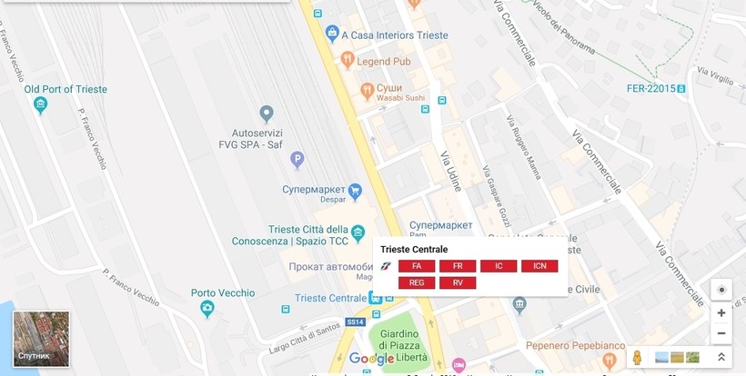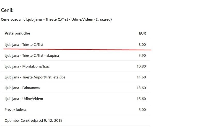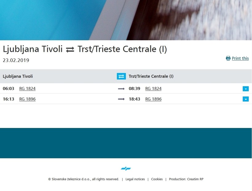 Из Любляны два раза в день идет поезд до Триеста (точнее, до Удине). Первый поезд уходит в 6 утра, а второй — в 4 часа дня.