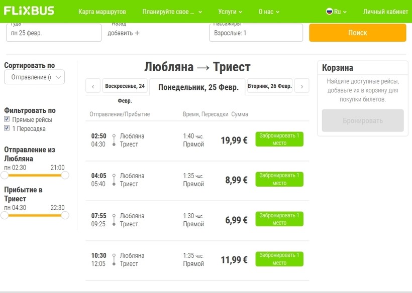Перевозчик Flixbus пускает автобусы из Любляны до Триеста 5–6 раз в день. Самый ранний рейс в 2 часа 50 минут ночи, а самый поздний — в 8 часов 40 минут вечера.