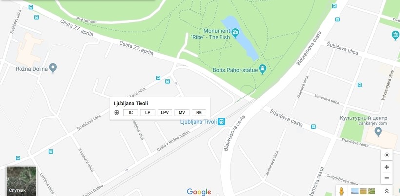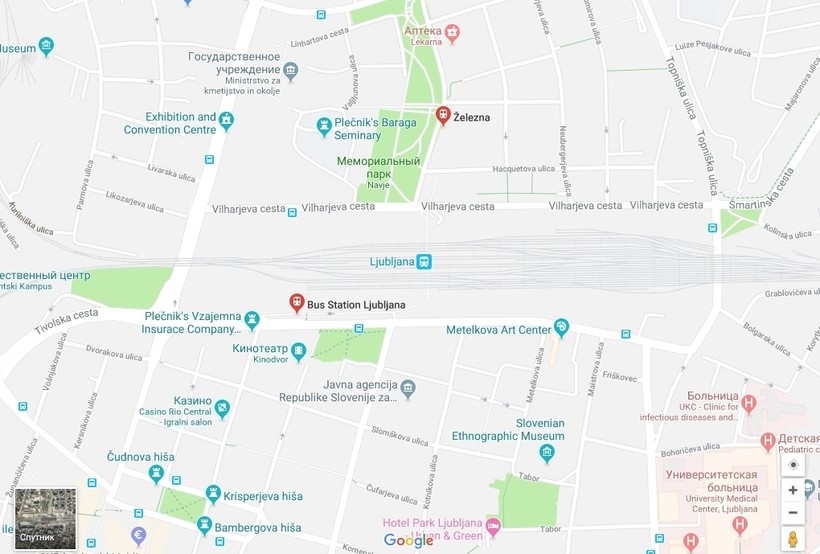 Но поезд комфортный — с огромными окнами, кондиционером, вай-фаем, туалетом, розетками. Уезжает поезд со станции Любляна-Тиволи.