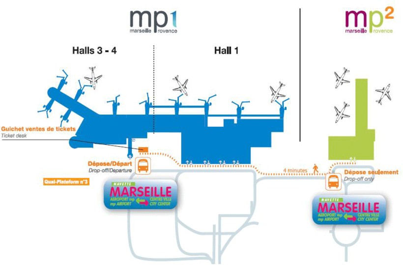 Добраться до автобусной остановки очень просто, она находится сразу при выходе из терминала 1, отправляются автобусы на Марсель с платформы №3. Если ехать надо от терминала 2, то это совершенно не проблема, между терминалами 4 минуты пешей ходьбы.
