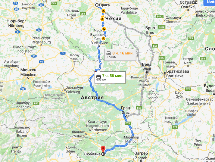 Чешскую и словенскую столицы разделяет чуть больше 700 км, преодолеть такое расстояние на автомобиле можно за 8 часов.