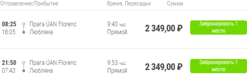 Поскольку прямых рейсов из Праги в Любляну нет, а ехать на поезде с 3 пересадками не очень комфортно, я предлагаю совместить поездку на поезде и автобусе. Это не самый удачный вариант поездки по маршруту, но возможный.