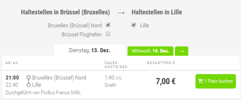 Автобус в пути будет от 1 часа 35 минут до 2 часов 10 минут, все зависит от того какой автобус будет ехать. Стоимость так же будет отличаться. На автобус, которой не будет делать остановок, стоимость будет дороже, а с остановками дешевле. Автобусы будут делать остановку на одном из железнодорожных вокзалов Лилля.