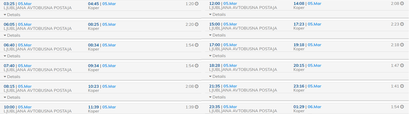 Основным перевозчиком из Любляны в Копер является словенская компания ARRIVA DOLENJSKA IN PRIMORSKA, но кроме этого следуют по маршруту и международные автобусы компаний: